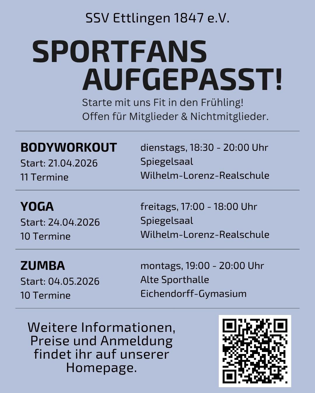 Die Abteilung Turnen der SSV Ettlingen 1847 e. V. startet mit neuen Kursangeboten fit in den Frühling.Alle Kurse sind offen für Mitglieder und Nichtmitglieder und richten sich an Erwachsene, die sich
