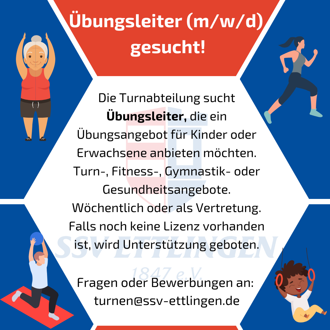 Die Turnabteilung sucht Übungsleiter, die ein Übungsangebot für Kinder oder Erwachsene anbieten möchten.Turn-, Fitness-, Gymnastik- oder Gesundheitsangebote.Wöchentlich oder als Vertretung.Falls noch keine Lizenz vorhanden ist, wird Unterstützung geboten. Fragen oder […]